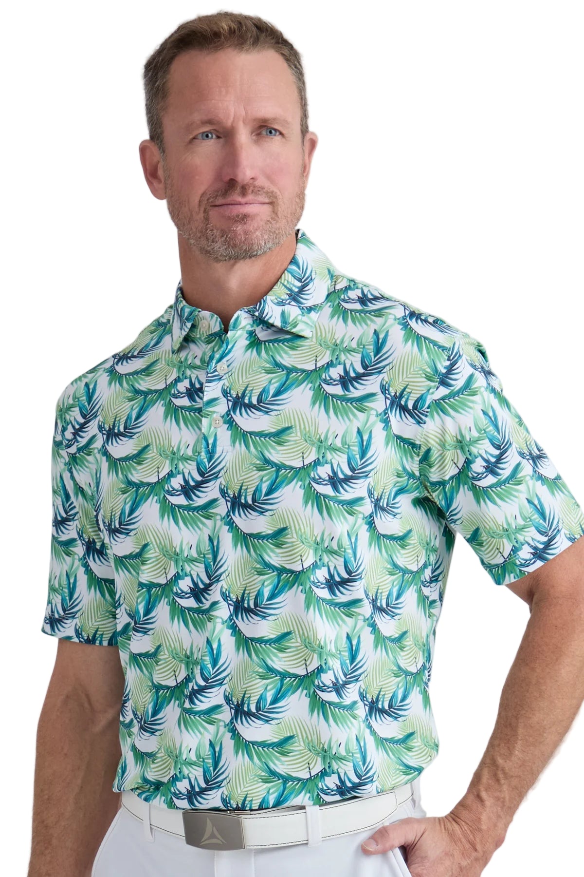 Bermuda's Men’s Owen polo, in a tropical leaf print, is made with their polyester / spandex jersey fabric, which is soft, lightweight, and breathable, making it perfect for on the course, out on the town or in a casual work environment.