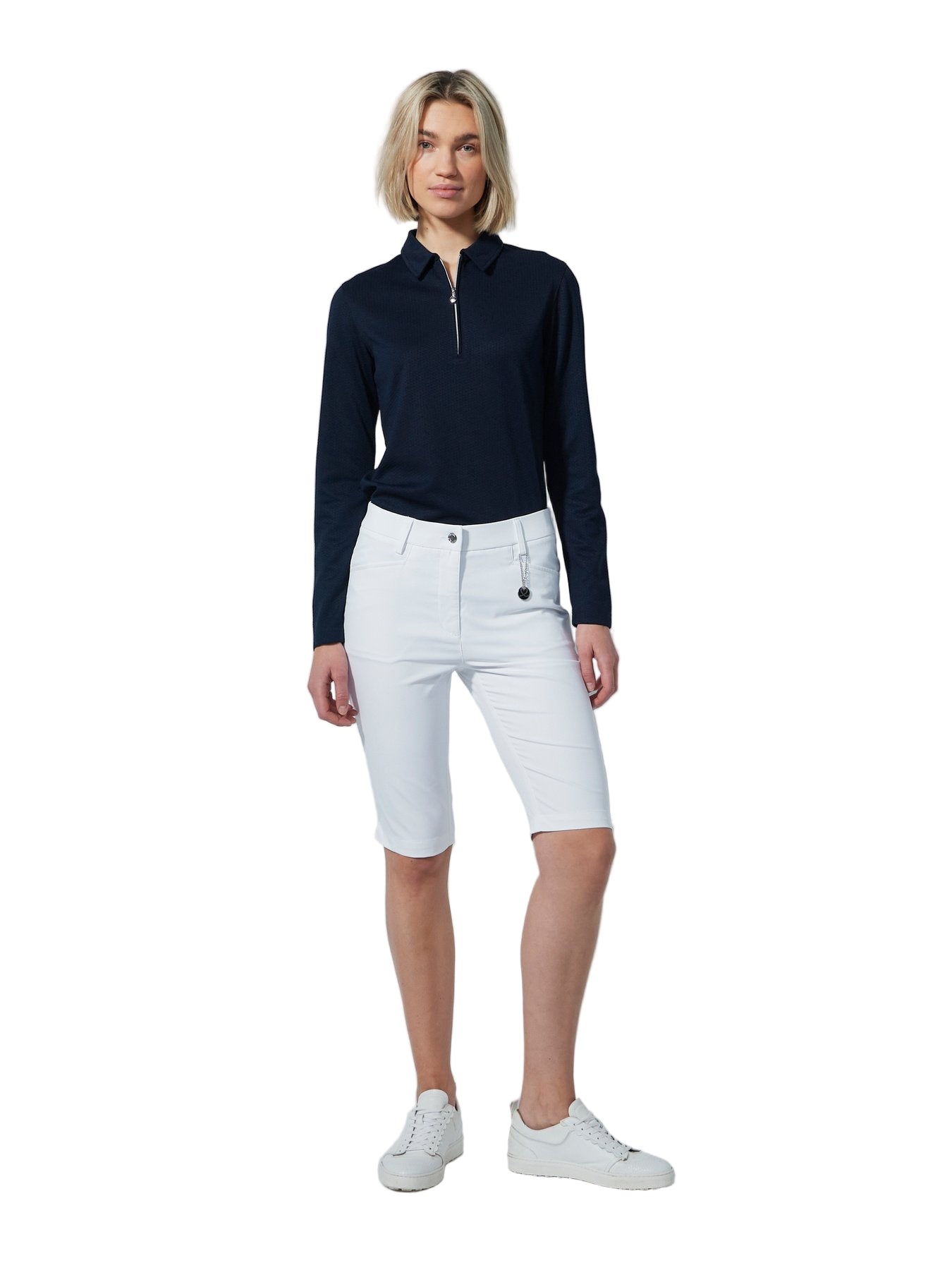 Daily Sports Bermuda Shorts Lyric V2 60cm White Woman wearing a navy sweater and white shorts on a plain background Woman wearing a navy sweater and white shorts on a plain background Woman wearing a navy long-sleeve top and white pants on a light gray background Daily Sports Bermuda Shorts Lyric V2 60cm White