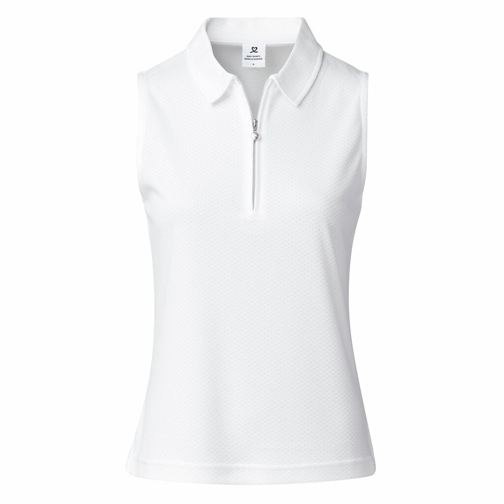 Peoria is a sophisticated sleeveless top with a neat collar, zip and jacquard-knit fabric that adds texture. It has a slightly fitted waist and is made from functional, recycled fabric that is moisture-wicking and keeps you cool.