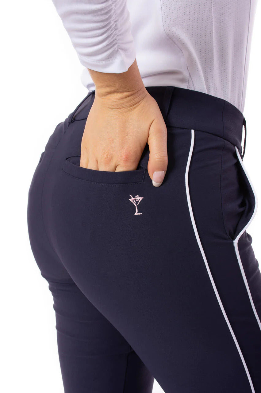 Look fabulous in the Navy Pull-On Ankle Pant with a sporty white stripe down the sides. This lightweight stretch pant offers sophistication and comfort, to be worn for golf, dinner, or a work-from-home look.