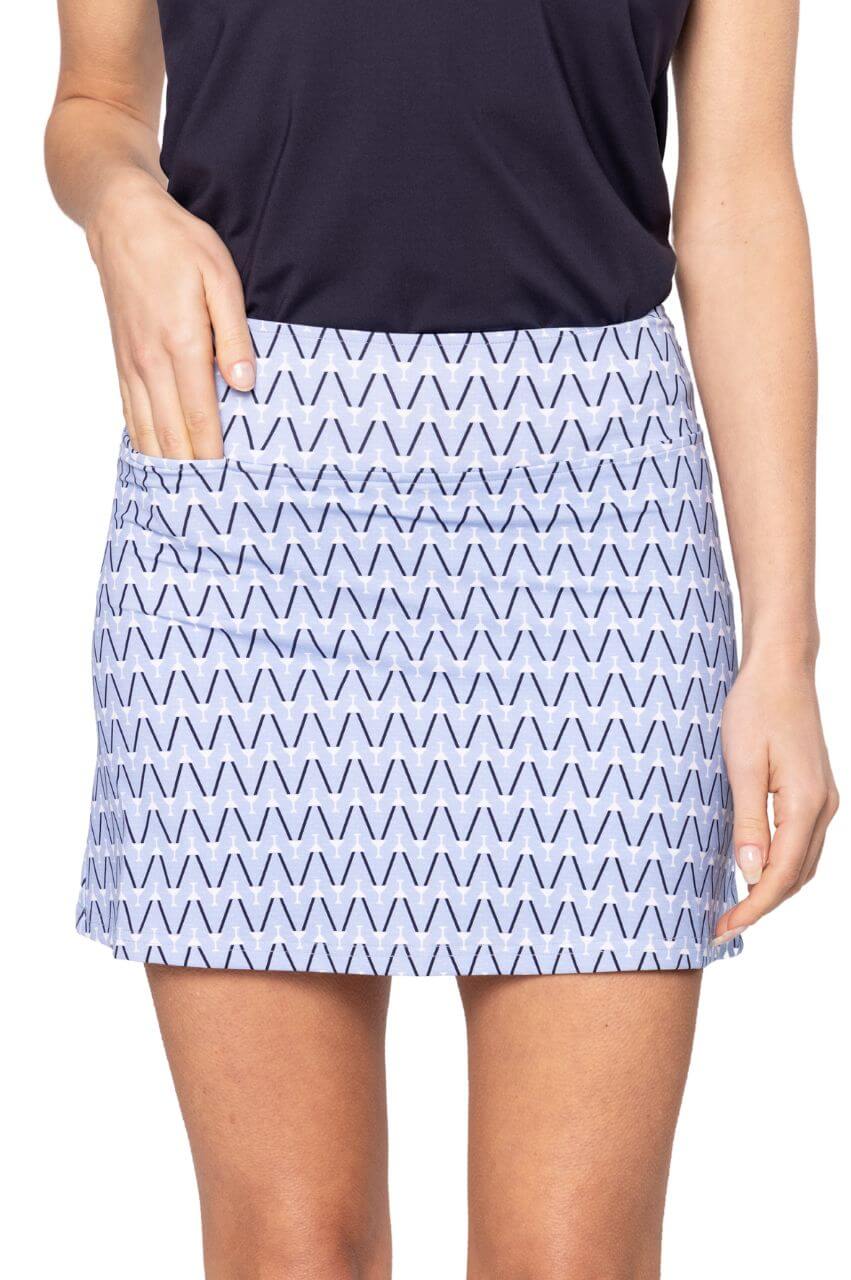 Introducing the Cool Girl pull-on skort in Nauti & Nice. The new nylon material features a lightweight, breathable fabric that keeps you cool while on the go. The skort features two back pockets for convenience, matching shorts, and a fun navy and seersucker blue martini pattern.