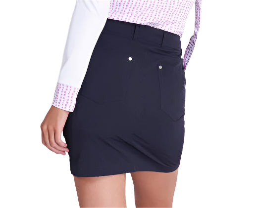 Sophisticated skort featuring shiny metal rivets front and back, at pockets and belt loops. The A-line shape is easy-to-wear and flattering for all while providing maximum comfort thanks to the lightweight and stretchy hidden shorts