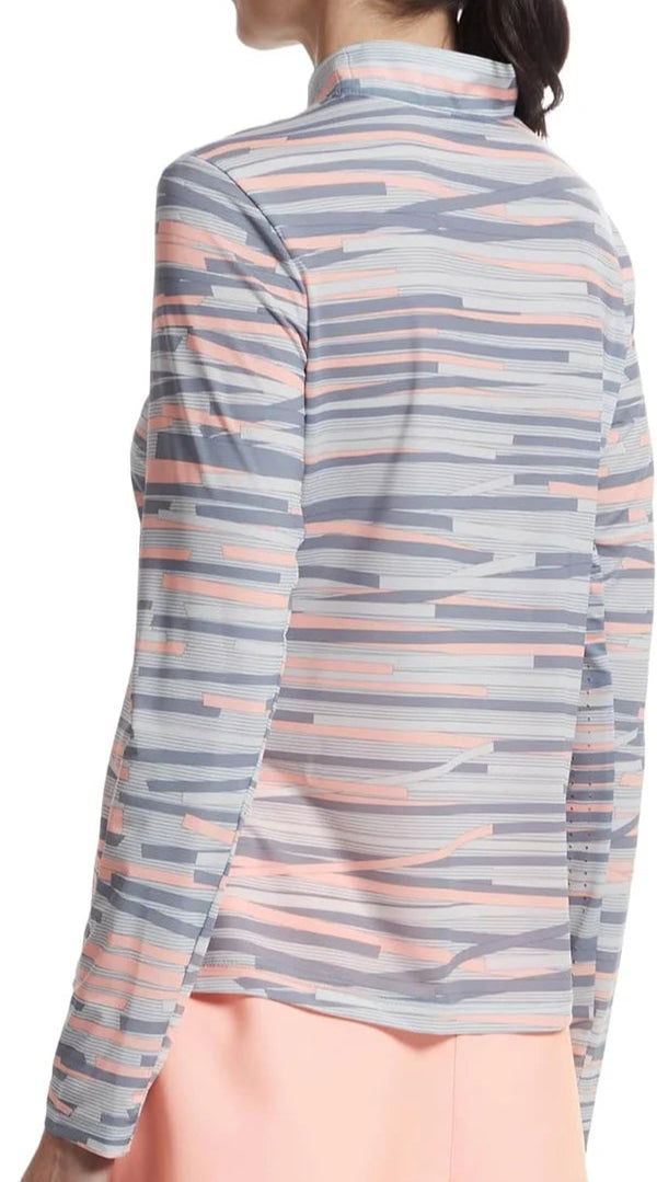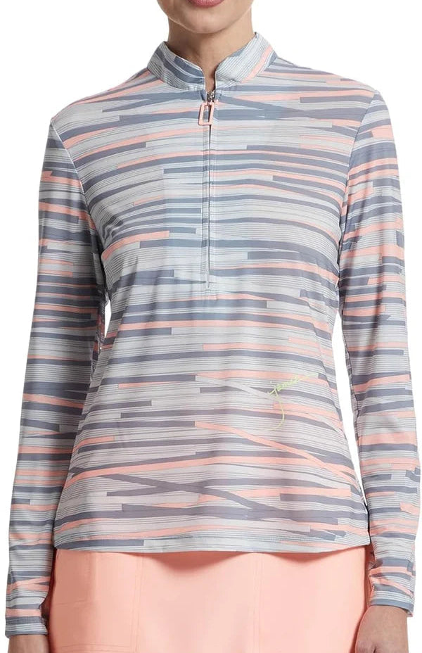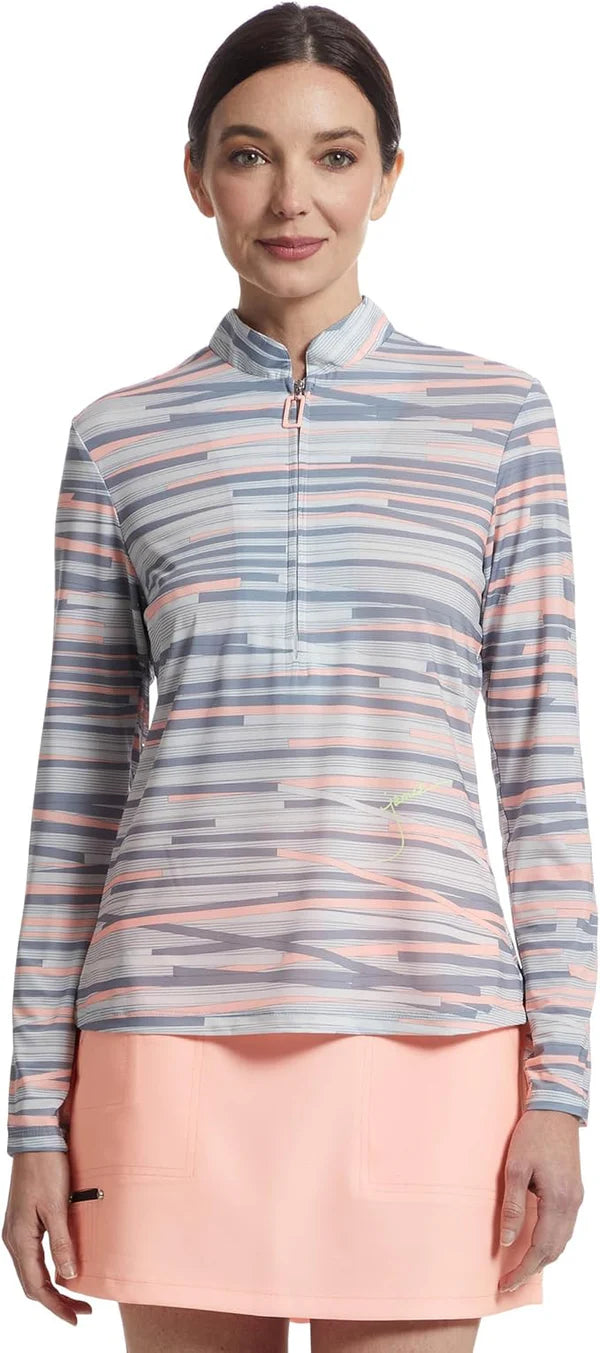 Pretty Shell Chopstix print , Long sleeved Sun Protection Shirt Design by Jamie Sadock Sun Sense. This shirt will keep you safe from the SUN!!! Yes that is right, UPF 50+ Ultralight Fabric keeps you protected all day during whatever outdoor activities you have planned. This thin material is so light it will literally feel like you have nothing on, made of 83% Nylon, 17% Spandex, Mock neck styled collar, and Zip Front Closure.